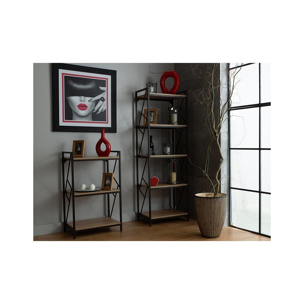 Konštrukcia regálu je vyrobená z pevného kovu v tmavo hnedej farbe a je doplnená o police z drevovláknitej dosky. Tie sú v dekore dubu. O stabilitu sa starajú kovové nohy, ktoré sú súčasťou konštrukcie.