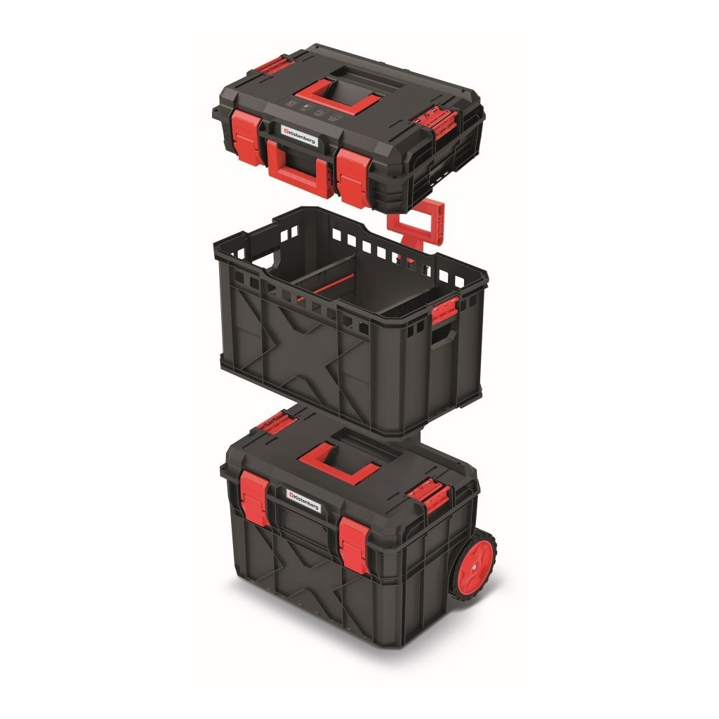 Takto si môžete poskladať celú prenosnú dielňu – v ponuke máme modely s organizérmi, dvojitými zámkami i upínacími lištami. Pre čo najpohodlnejší transport odporúčame ako základňu celej zostavy použiť model na kolieskach.