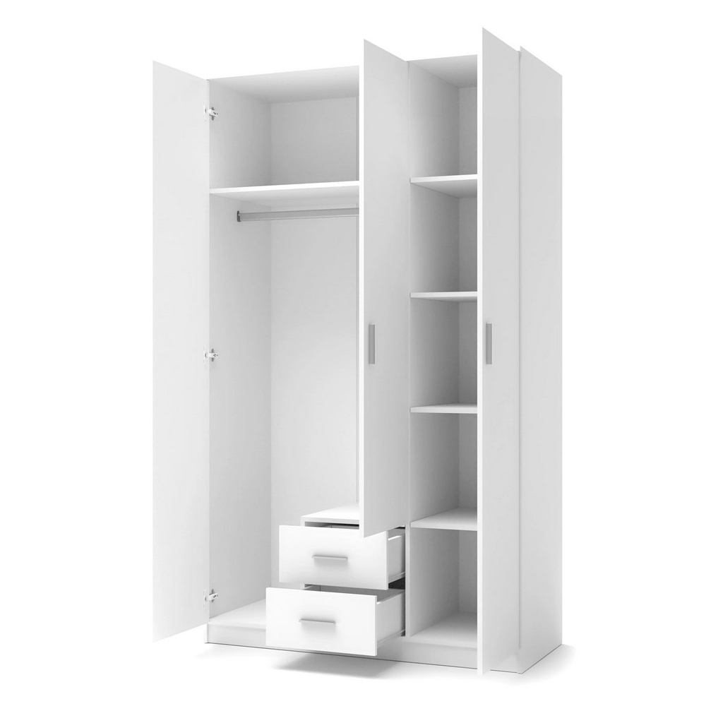 Korpus skrine sa delí na 3 oddiely. V ľavom bočnom krídle sa nachádza vysoký oddiel s držiakom na ramienka na šaty a policový oddiel. Prostredná časť skrine je pokračovaním oddielu na šaty. Zahrňuje naviac 2 šuplíky. Pravé bočné krídlo sa delí na 5 úložných priestorov oddelených policami.