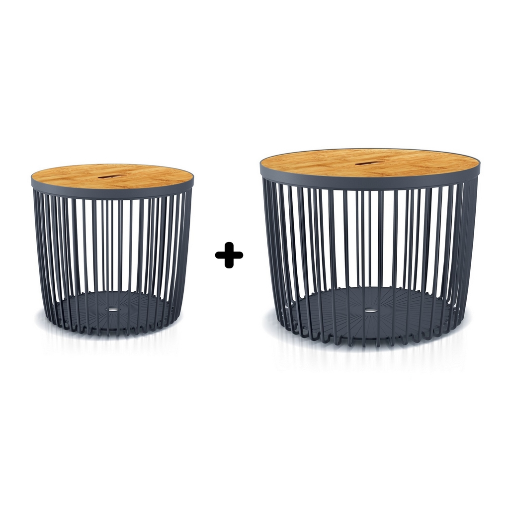 Úložné priestory, alebo odkladacie stolíky? Rozhodnite sa sami! Tieto univerzálne koše ponúkajú niekoľko riešení v jednom produkte. Využite ich ako stolíky pre odloženie šálky kávy a kľudne do nich uschovajte napríklad deky. Koše sú vyrobené z pevného plastu a odnímateľné veká z bambusu. Priemer viek je 45 a 59 cm.