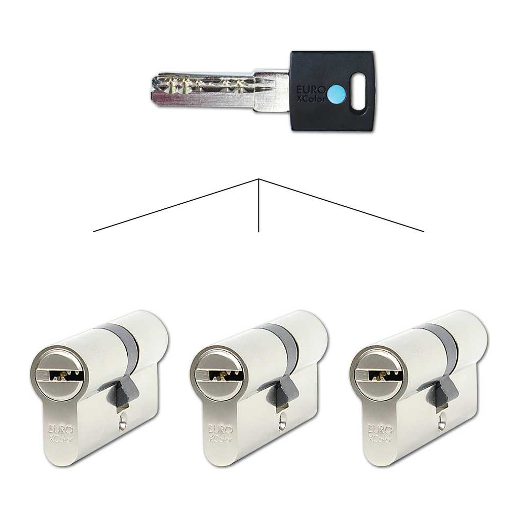 Toto balenie obsahuje 3 stavebné vložky na rovnaký kľúč. Toto riešenie je ideálne pre dvere s viacerými zámkami alebo miestnosti s niekoľkými vchodmi, ku ktorým nechcete nosiť ďalšie kľúče. Na výber máte z niekoľkých farebných označení kľúčov, takže ak si týchto sád zaobstaráte viac, ľahko si v nich udržíte prehľad.