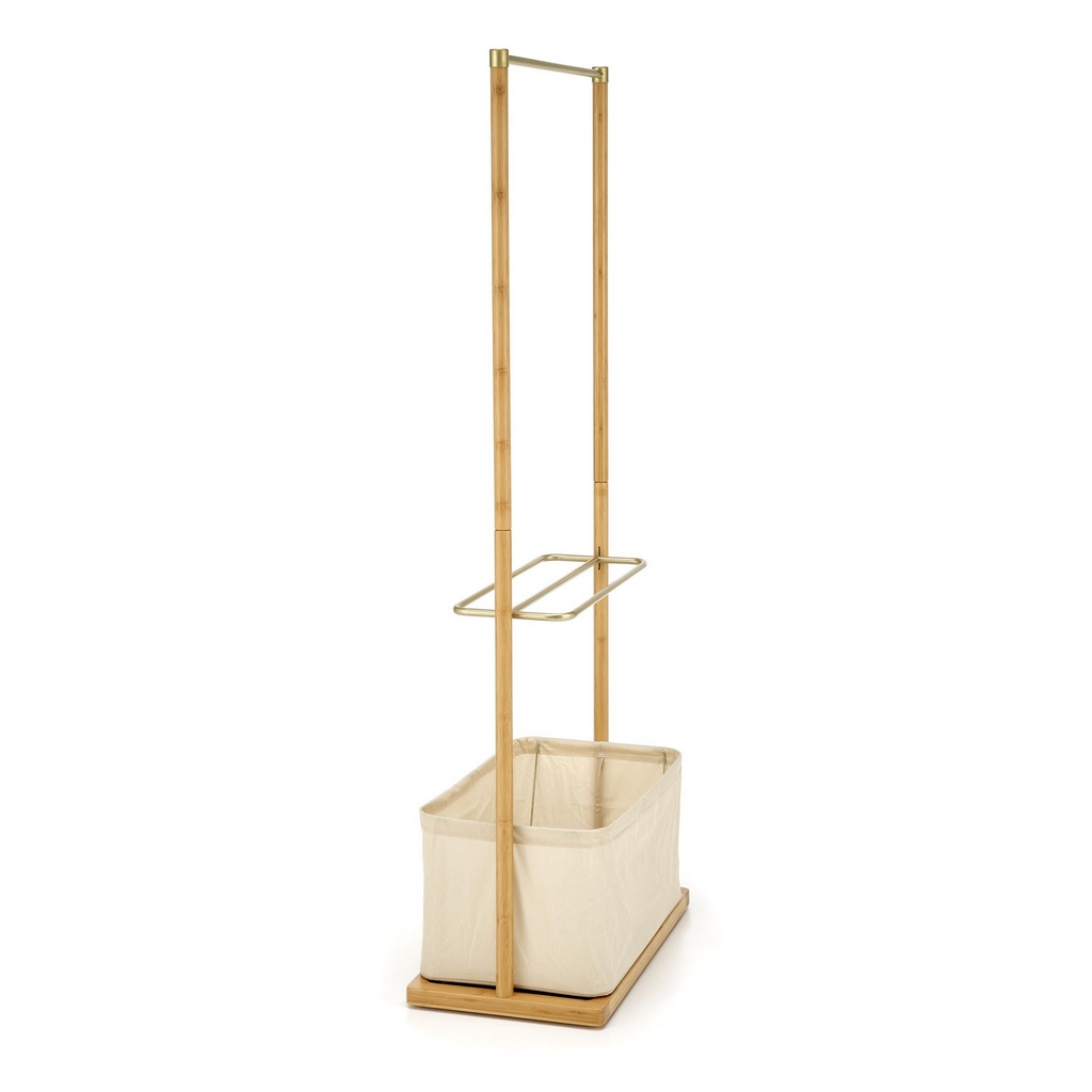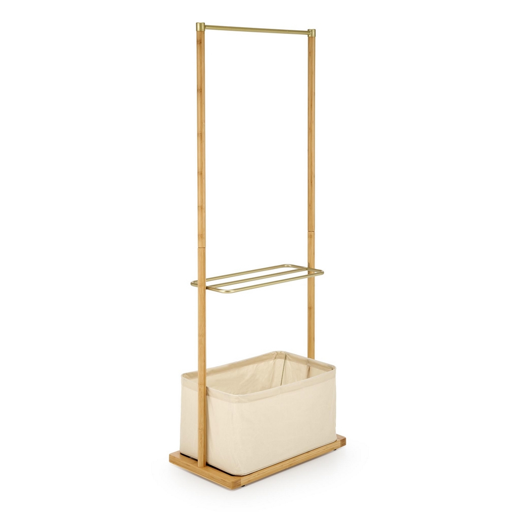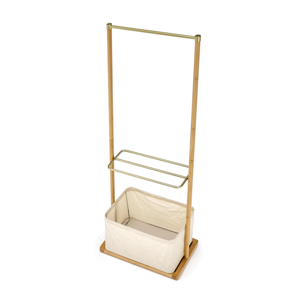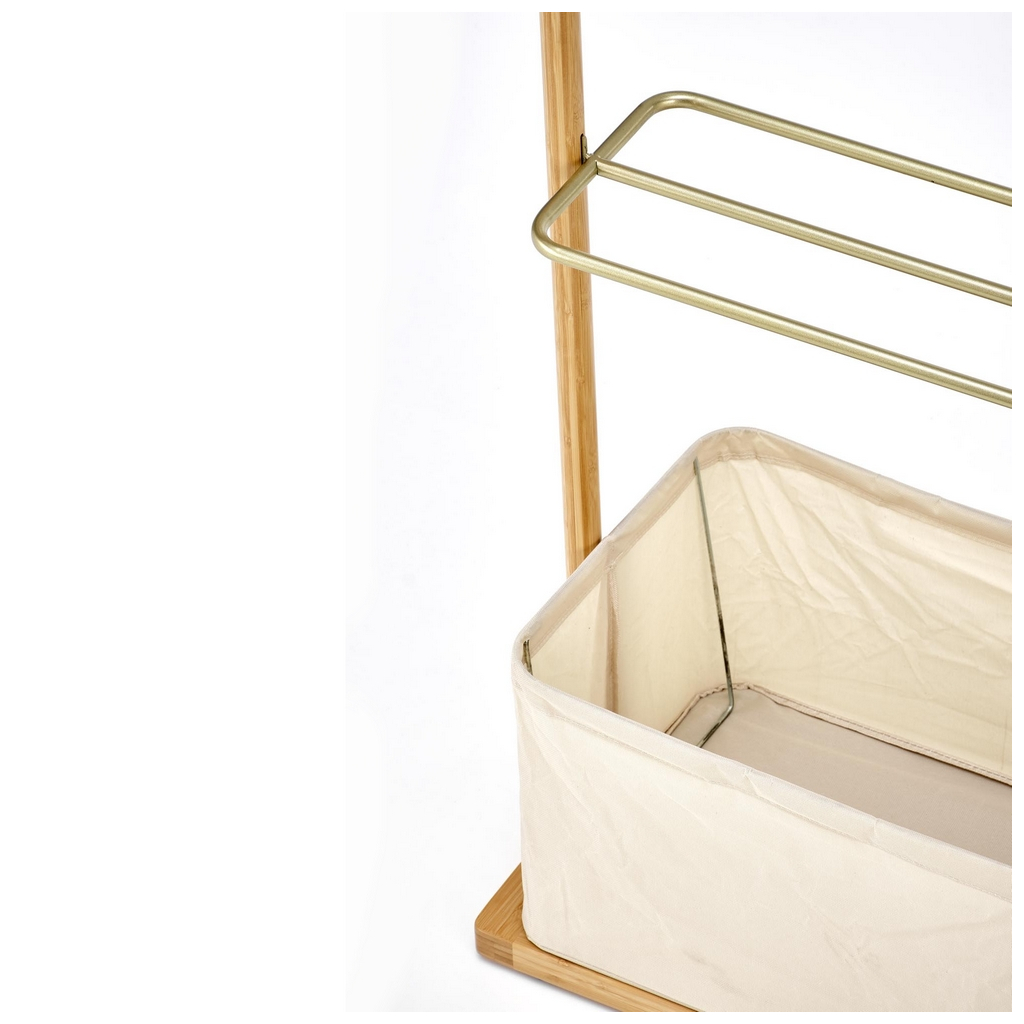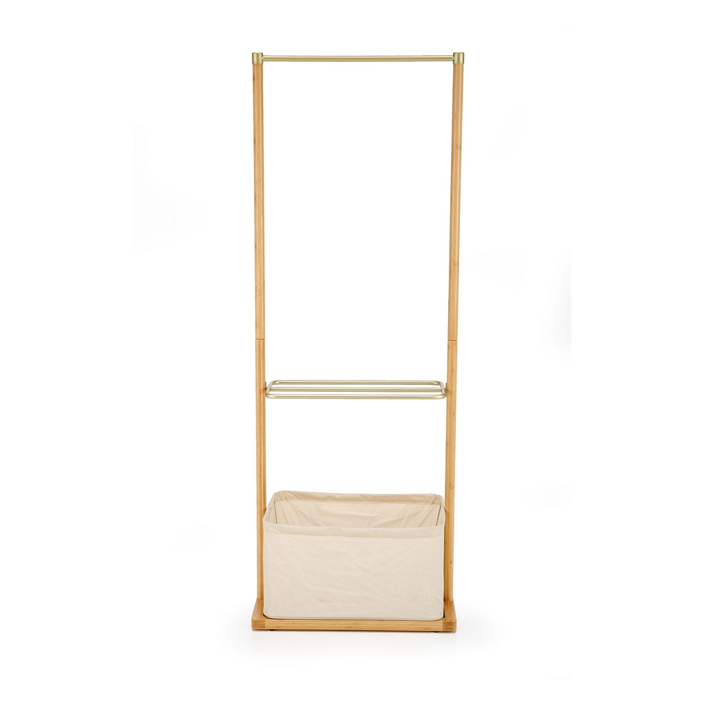 Bambusovú konštrukciu ozvláštňujú prvky z práškovanej ocele v zlatej farbe. Okrem vešiakovej tyče je oceľová aj polica, ktorá poslúži na odloženie domácej obuvi. V spodnej časti nájdete praktický látkový košík pre šatky, klobúky, dáždniky alebo napríklad uteráky.