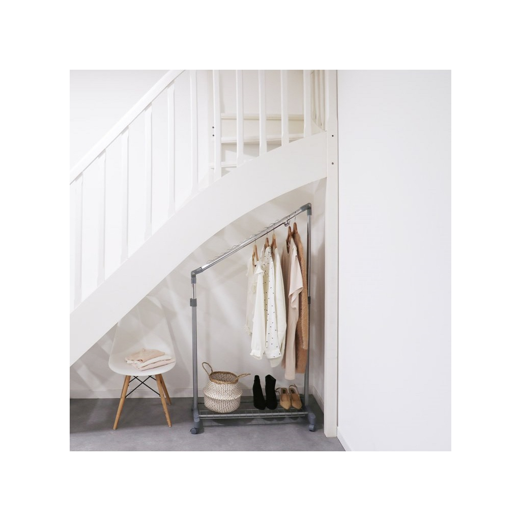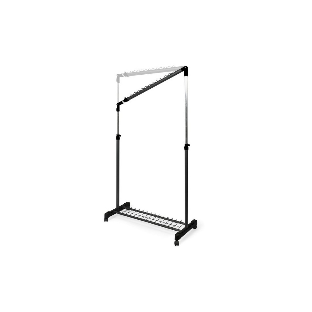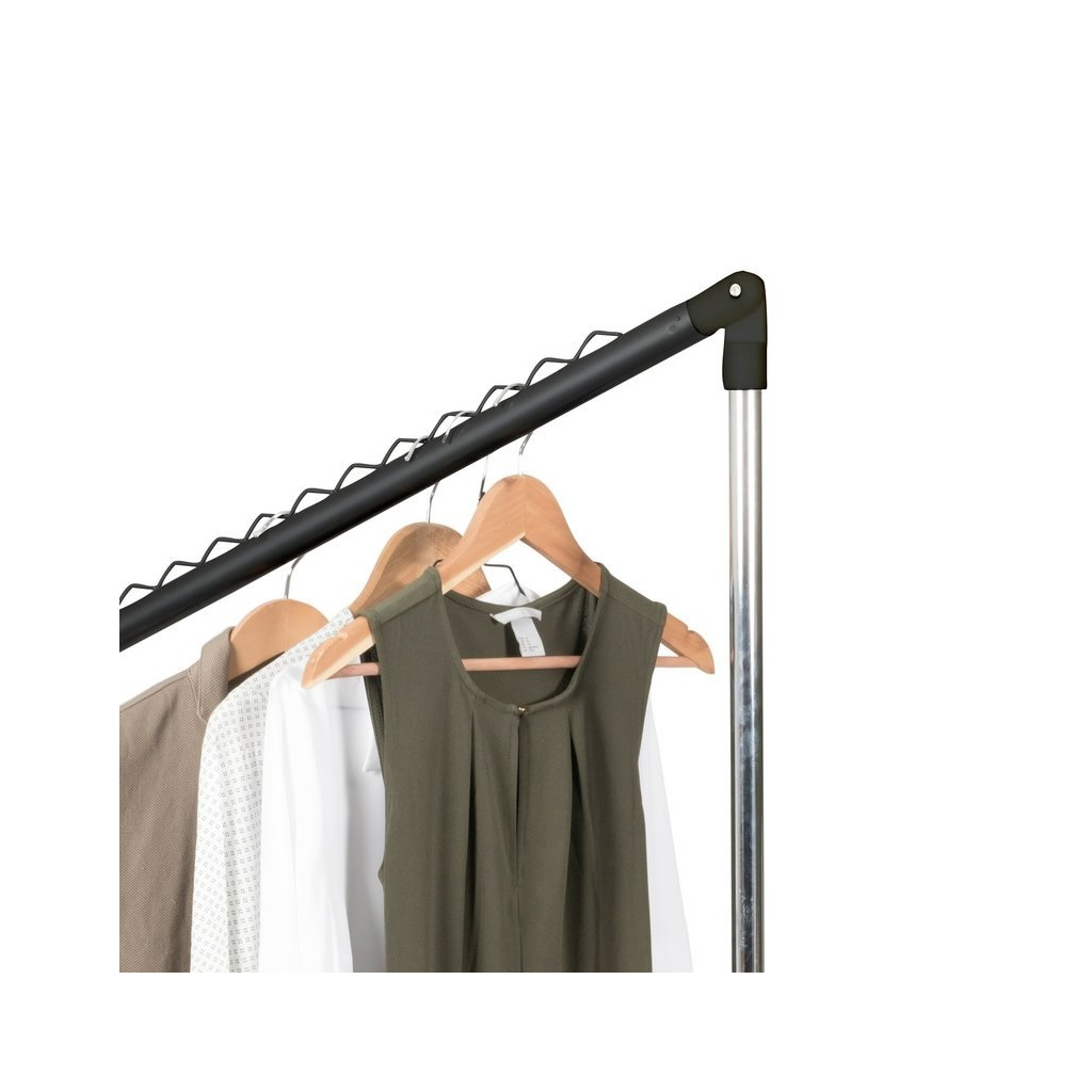 Stojan je vyrobený v kombinácii kovu s plastovými časťami. Disponuje tyčou na zavesenie odevov a spodnou mriežkou na uloženie topánok. Výhodou stojanu je možnosť výškového nastavenia závesnej tyče od 102 do 170 cm. Pre jednoduchú manipuláciu po priestore isto oceníte tiež kolieska.