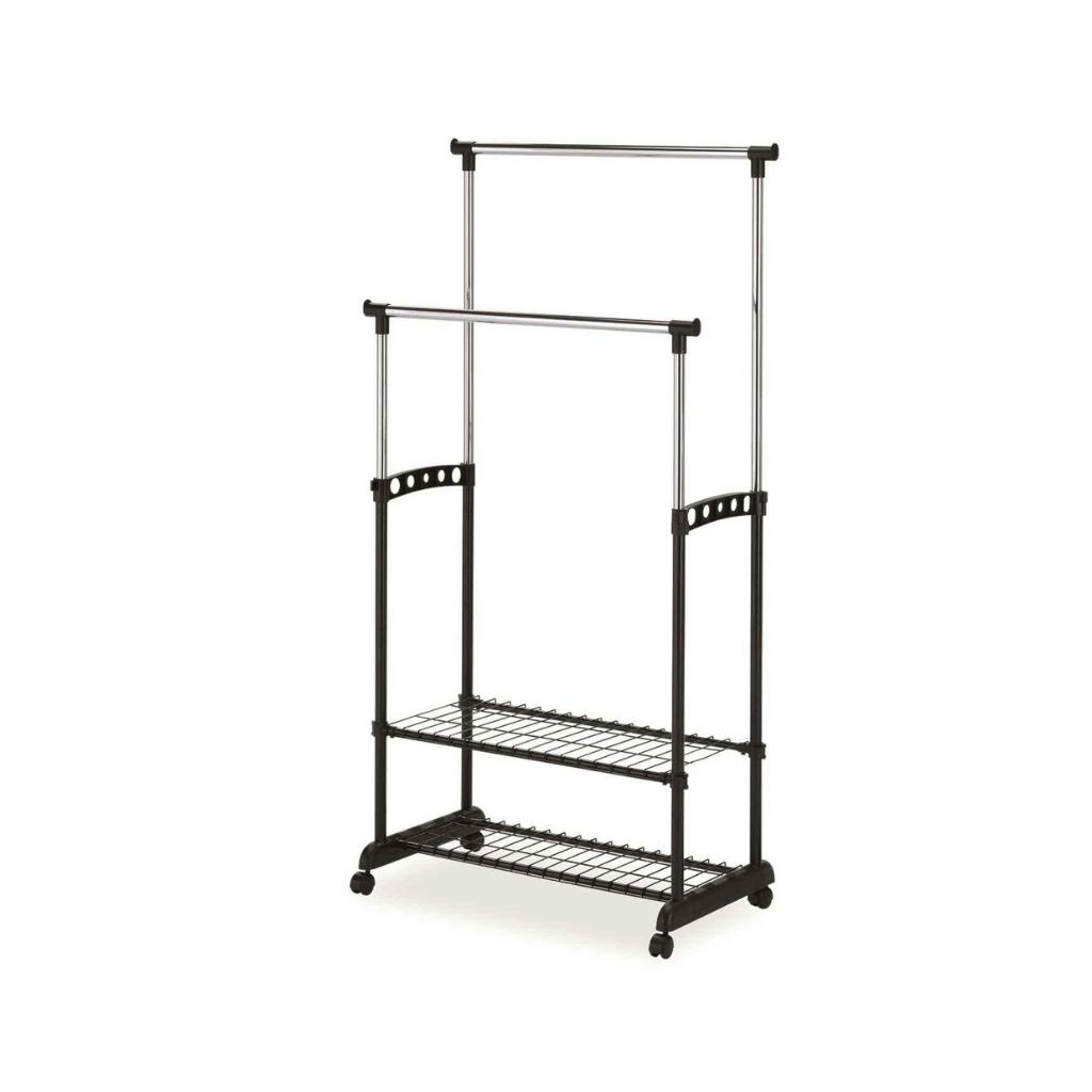 Stojan je vyrobený v kombinácii kovu s plastovými časťami. Disponuje 2 odkladacími tyčami pre zavesenie odevov a spodnou mriežkou na uloženie topánok. Výhodou stojanu je možnosť výškového nastavenie oboch závesných tyčí od 94 do 168 cm. Pre jednoduchú manipuláciu po priestore isto oceníte tiež kolieska.