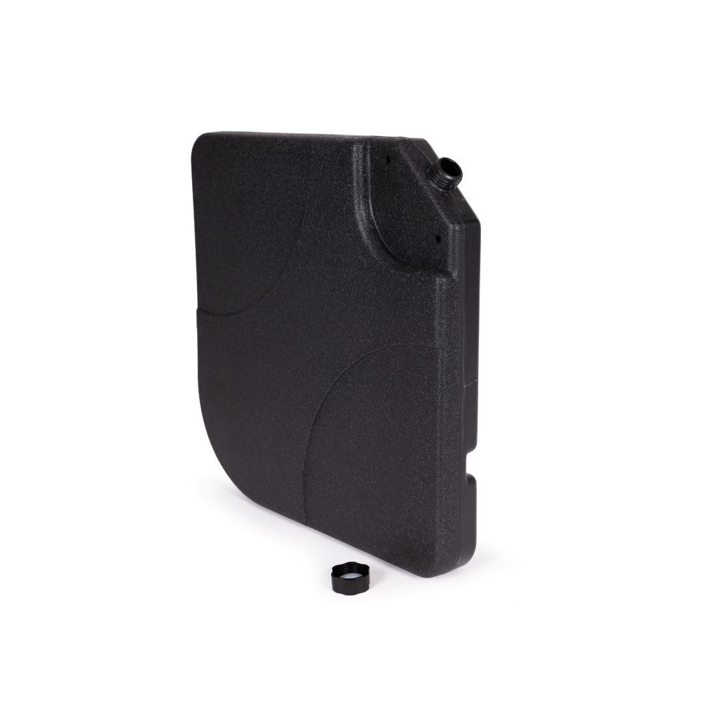 Každá časť konštrukcie pojme 15 litrov vody, pri plnej kapacite teda stojan váži niečo cez 60 kg. Jednotlivé diely držia pohromade pevné kovové spony. Samotné nádrže sú z odolného plastu (HDPE), ktorý hravo zvládne dlhodobú vonkajšiu prevádzku.
