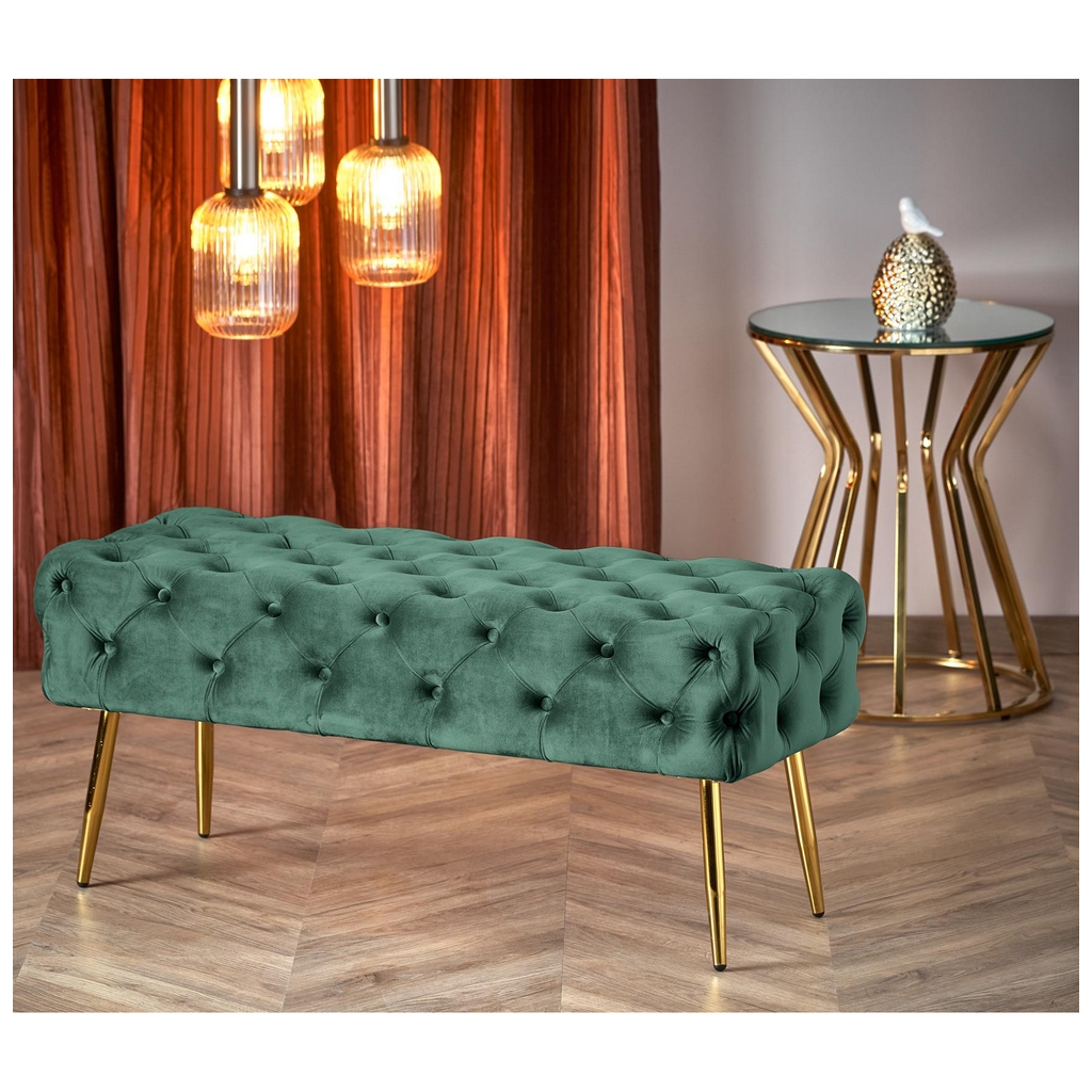 Dodajte svojej obývačke alebo relax zóne trochu pompy s taburetom Athena. Na sedadle potiahnutom prešívanou zamatovou látkou si posedíte ako v bavlnke, o stabilitu a ďalšiu dávku elegancie sa potom postarajú pozlátené nohy z ocele.