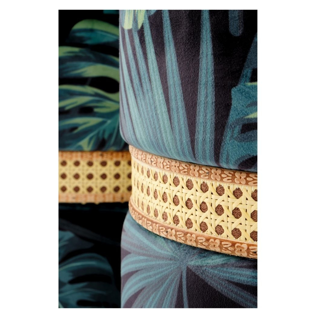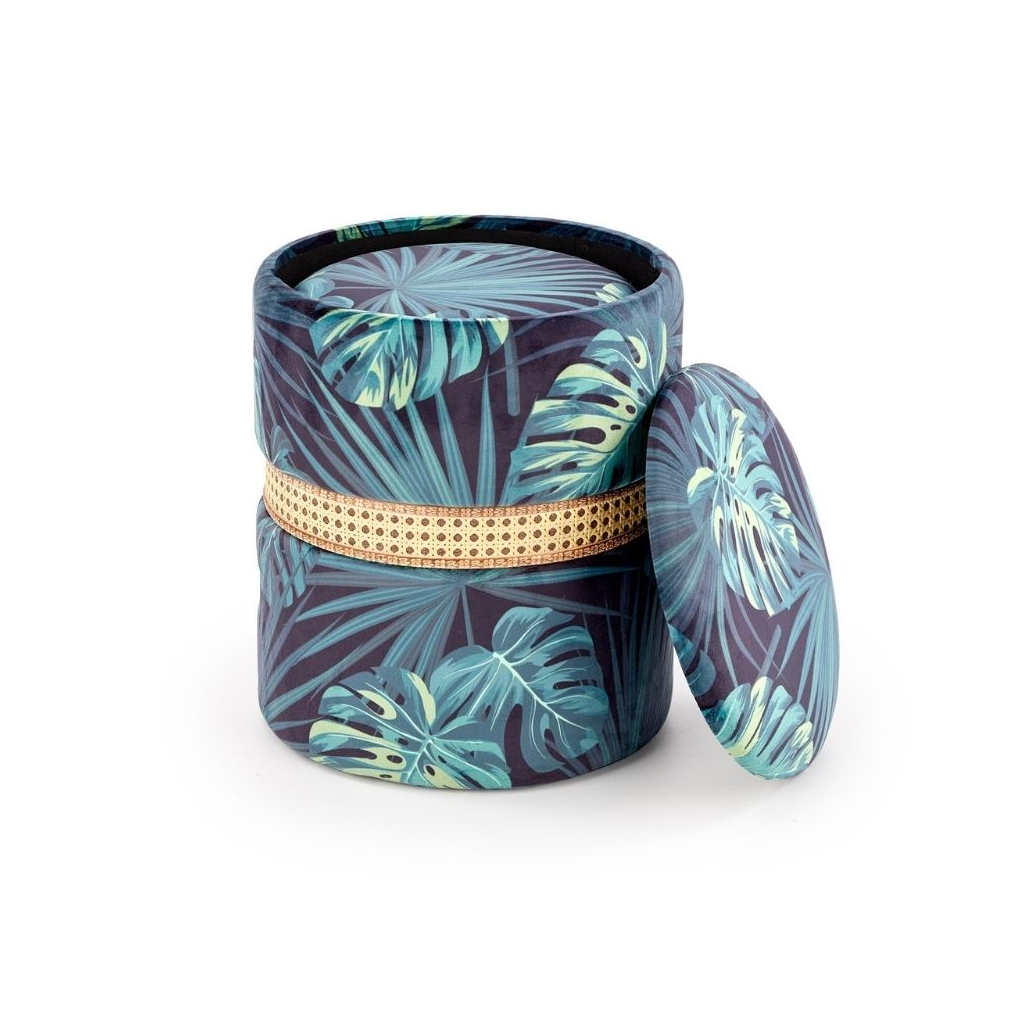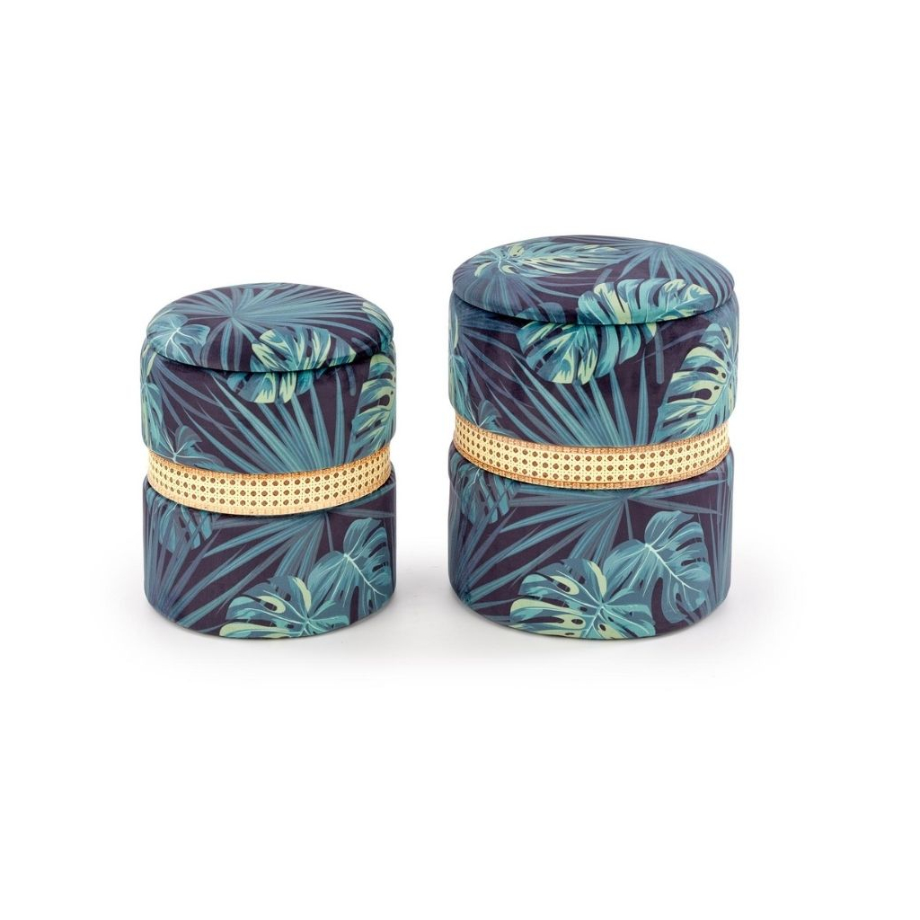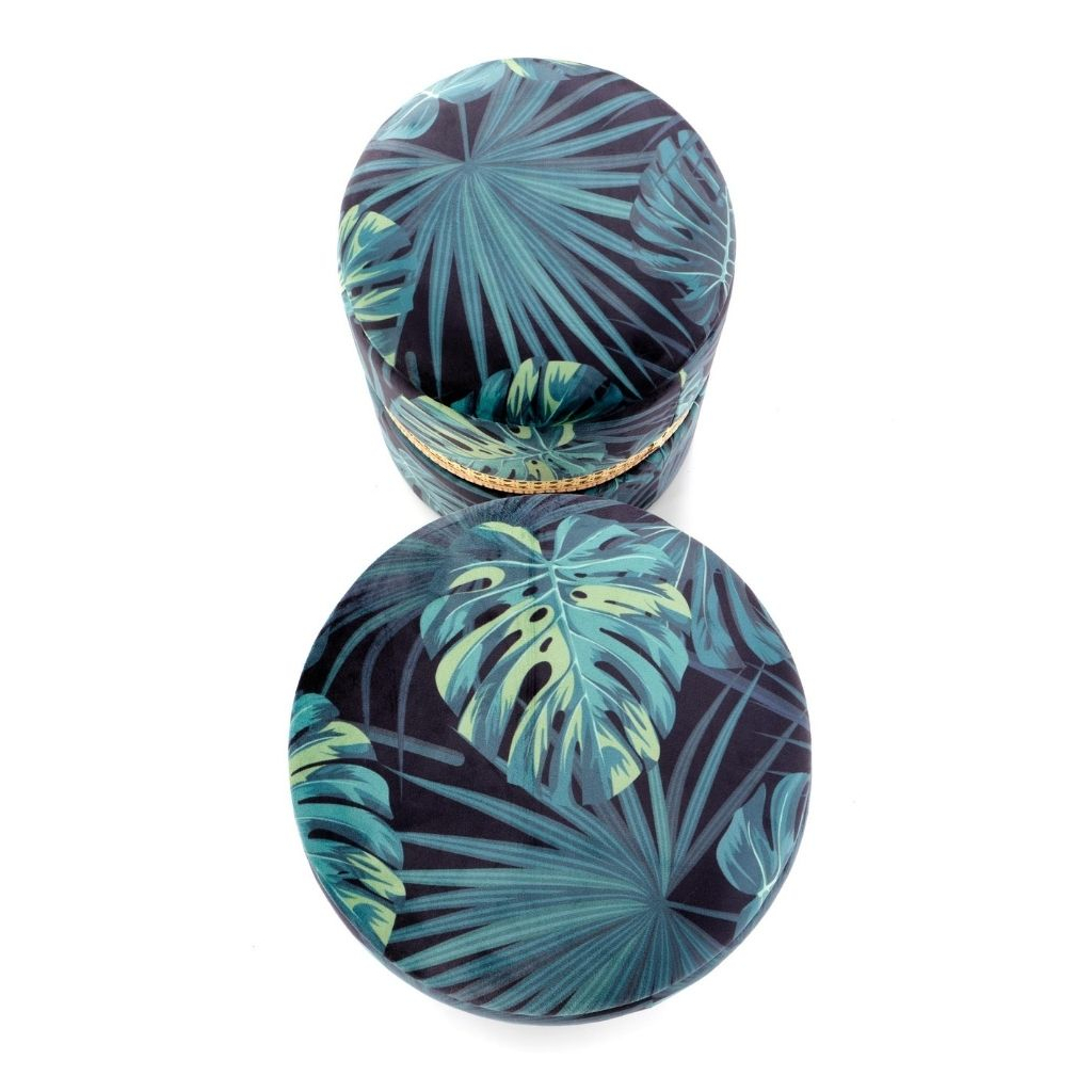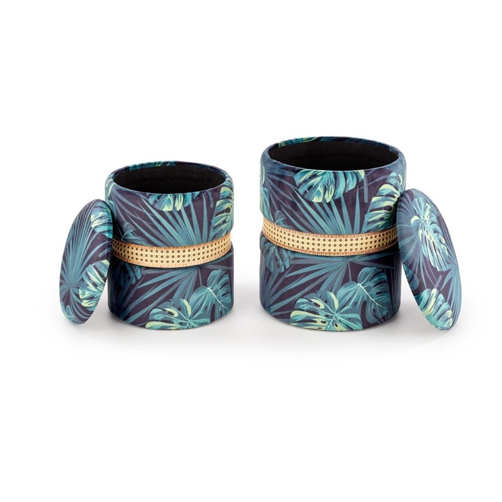 Výrazný vzor je doplnený ozdobným lemom z umelého ratanu. Taburety súčasne disponujú úložným priestorom pod sedadlom, kam upracete hračky, deky, noviny alebo čokoľvek potrebujete.