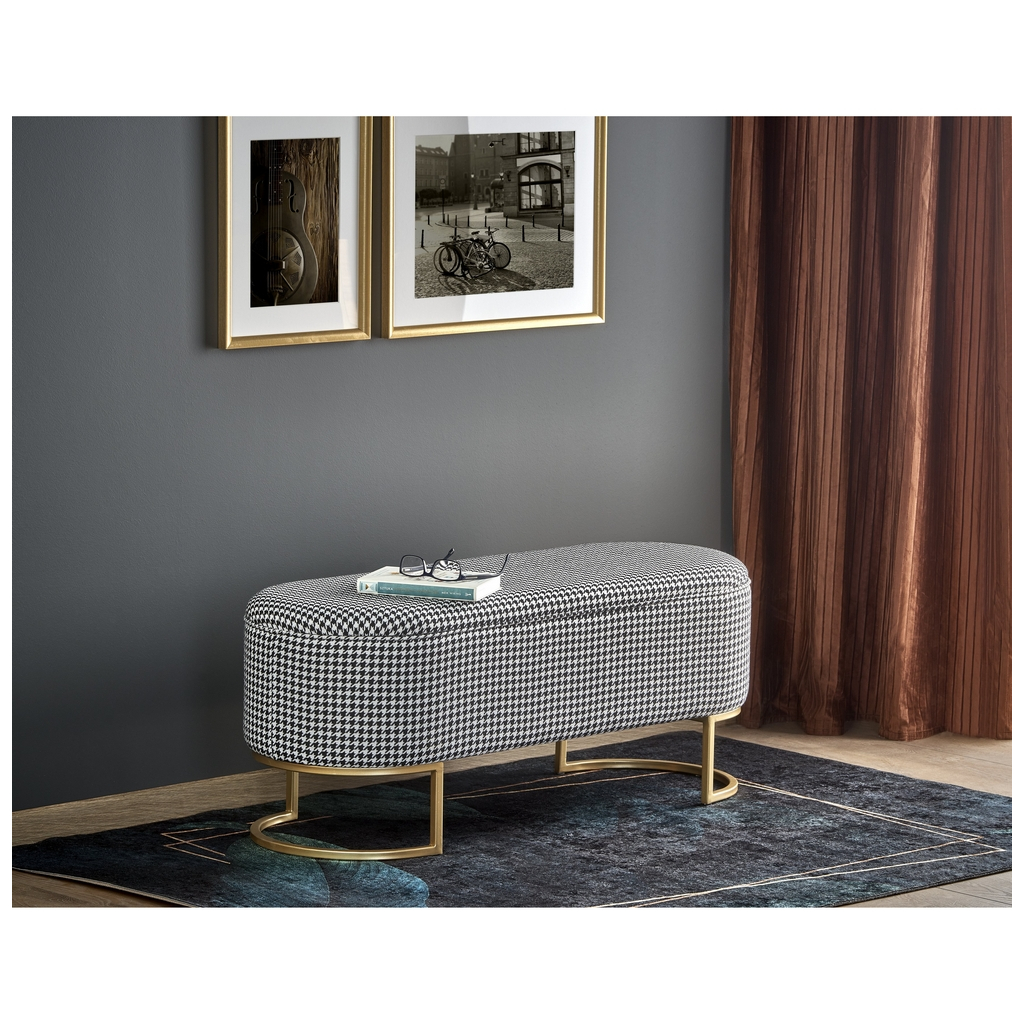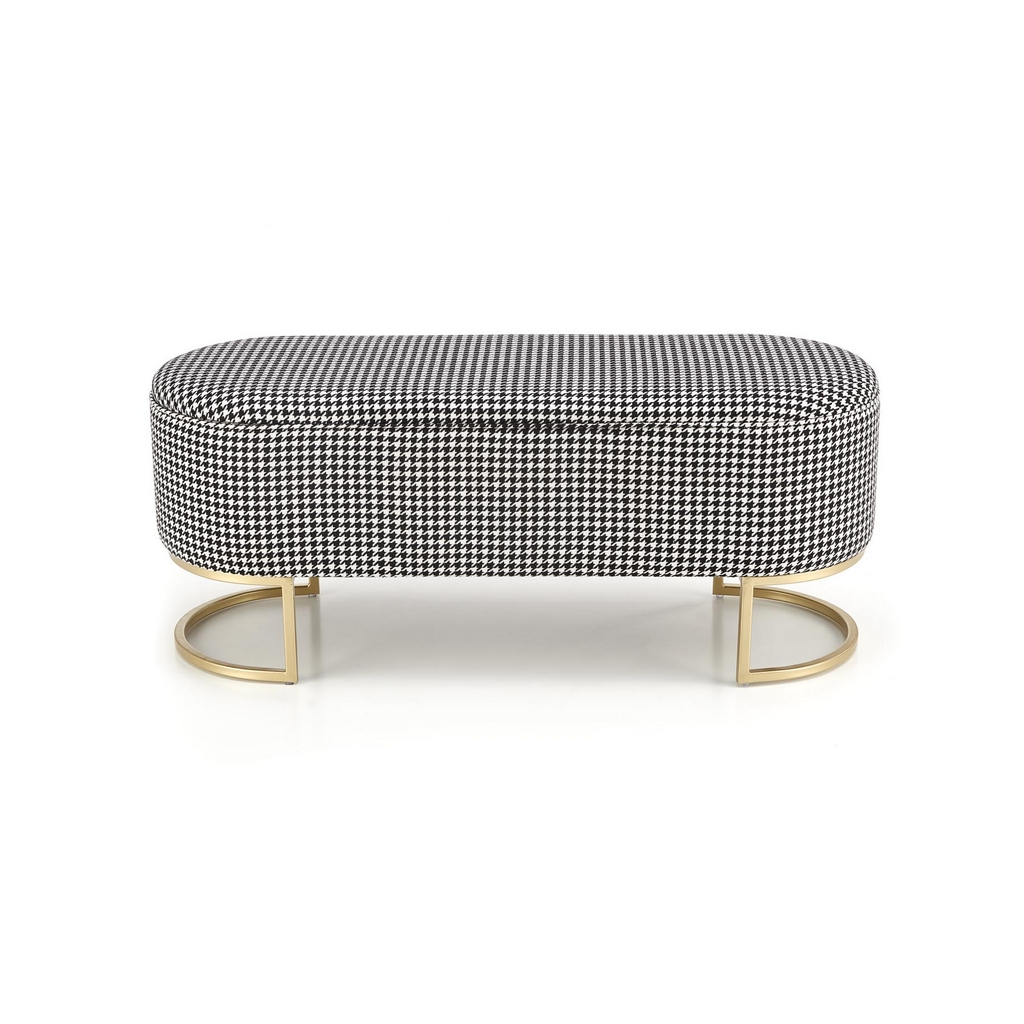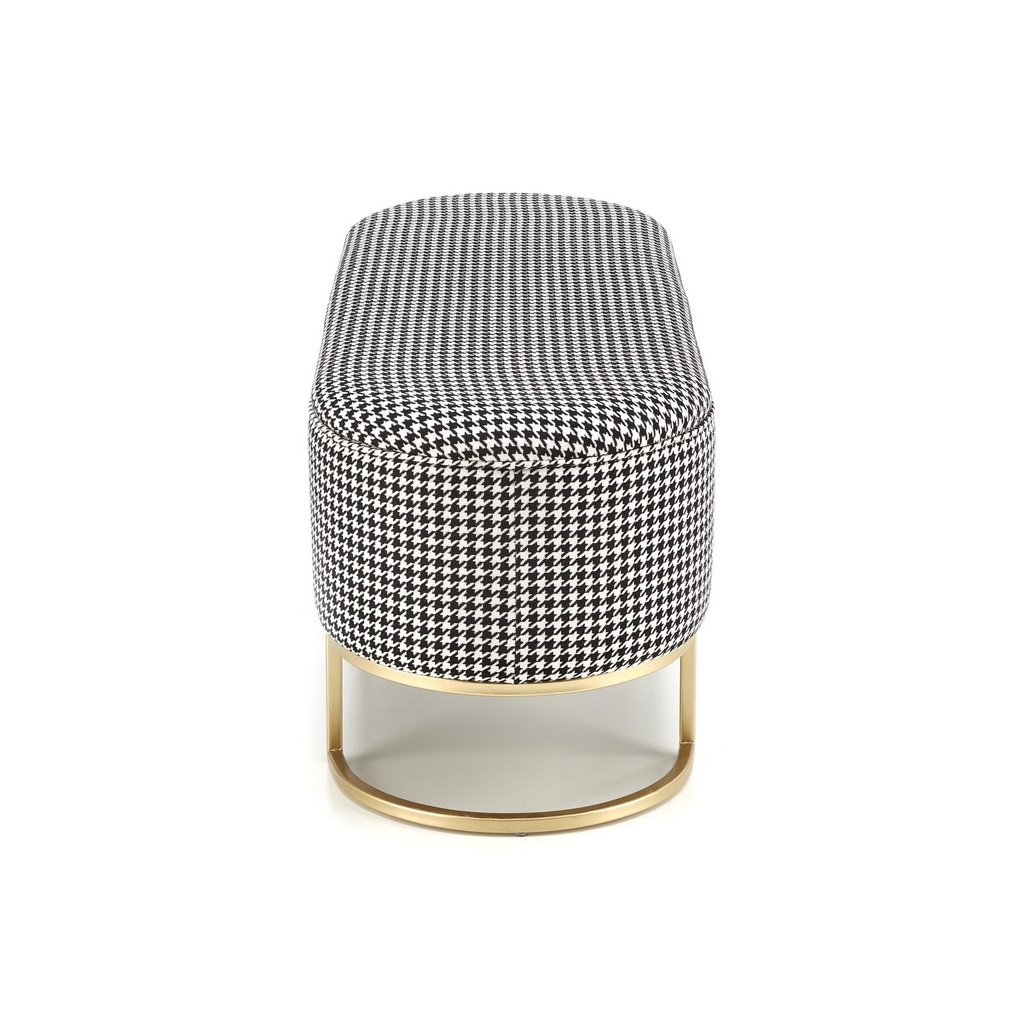 Taburet je potiahnutý príjemnou látkou s nadčasovým vzorom kohútej stopy. Spolu so zlatou podnožou z práškovanej ocele taburet skutočne pôsobí ako šperk. Práve vďaka svojmu prevedeniu sa hodí do moderných spální a honosných hotelových izieb.
