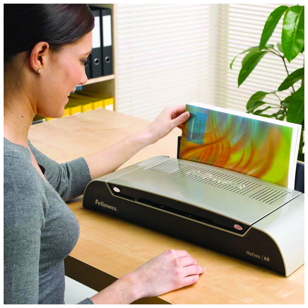 Termoviazač Fellowes Helios 60 je skvelým pomocníkom do kancelárie na dierovanie a viazanie dokumentov. Je vhodný na príležitostné používanie. Umožňuje vykonávať termoväzbu jedného alebo viacerých zväzkov súčasne až do celkovej hrúbky 30 mm. Stránky k sebe viaže pomocou lepidla, ktoré je vo viazači ohrievané do tekutej podoby, čím dôjde k zapečeniu väzby. Výsledný zväzok vyzerá reprezentatívnejšie ako dierovaný dokument. Vďaka premyslenej konštrukcii sa s týmto prístrojom pracuje veľmi pohodlne. Široký pôdorys stroja zaistí skvelú stabilitu pri práci.