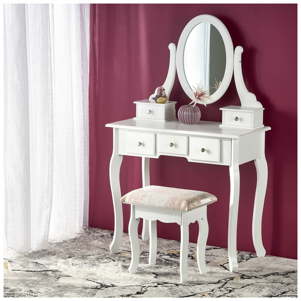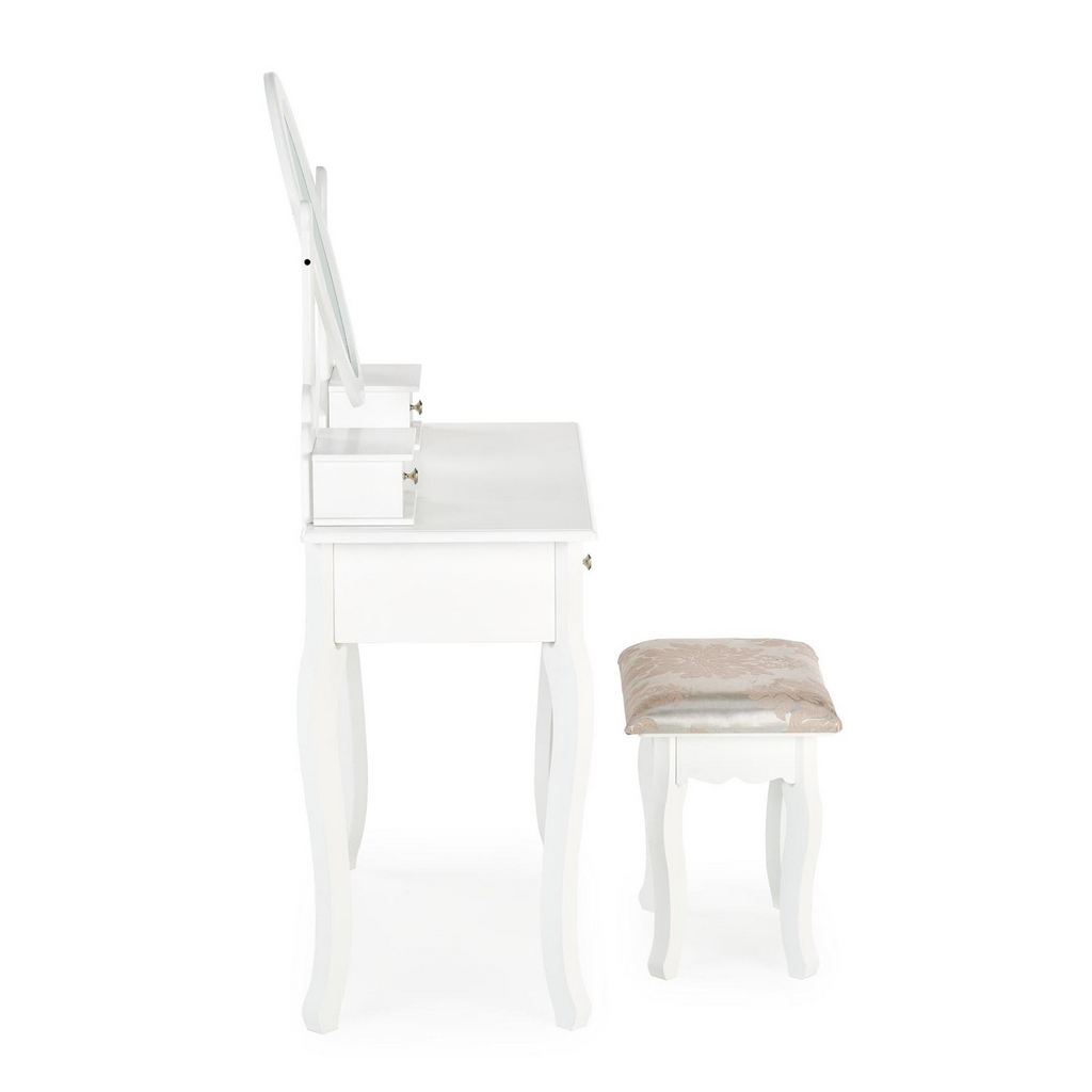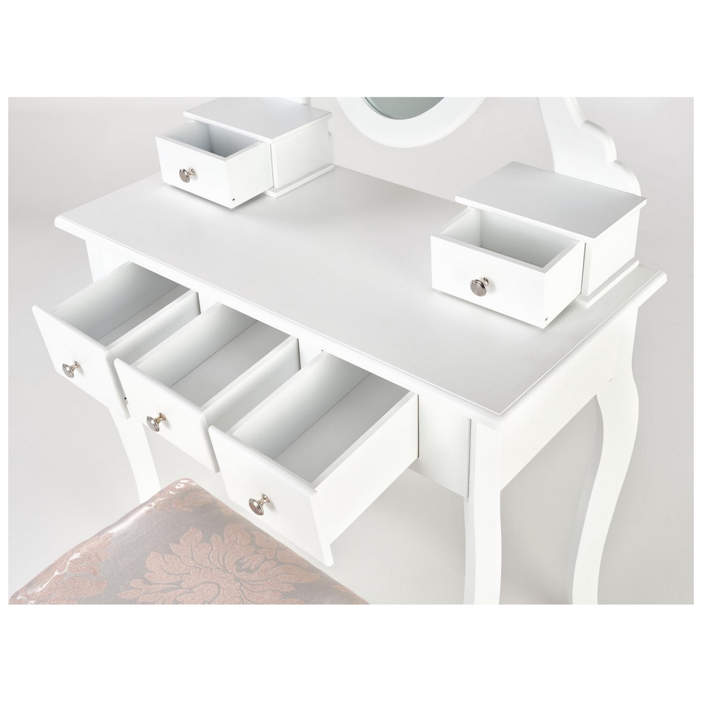 Ak dávate prednosť tradičnejšiemu dekoru, toaletný stolík Sara vás určite nadchne – ozdobný dizajn stolíka i taburetu totiž pôsobí takmer viktoriánsky. Vkusná je taktiež kombinácia bieleho laku so staroružovým čalúnením.