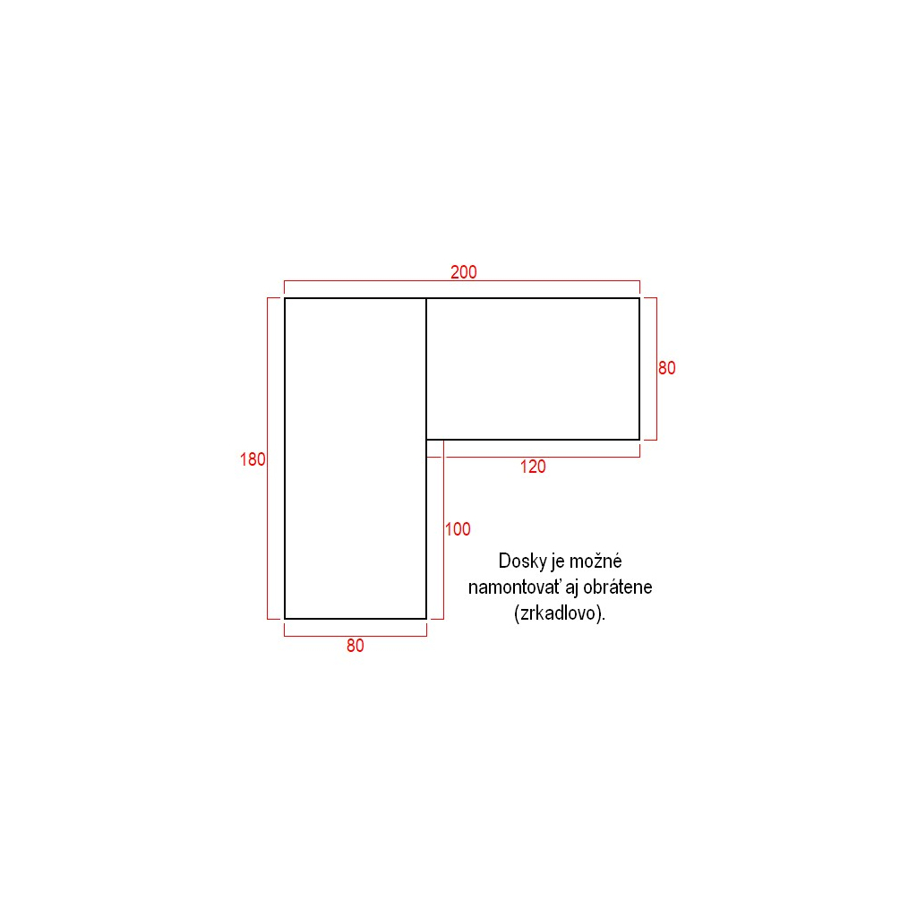 - Pracovnú plochu tvoria dve dosky o rozmeroch 180 × 80 cm a 120 × 80 cm