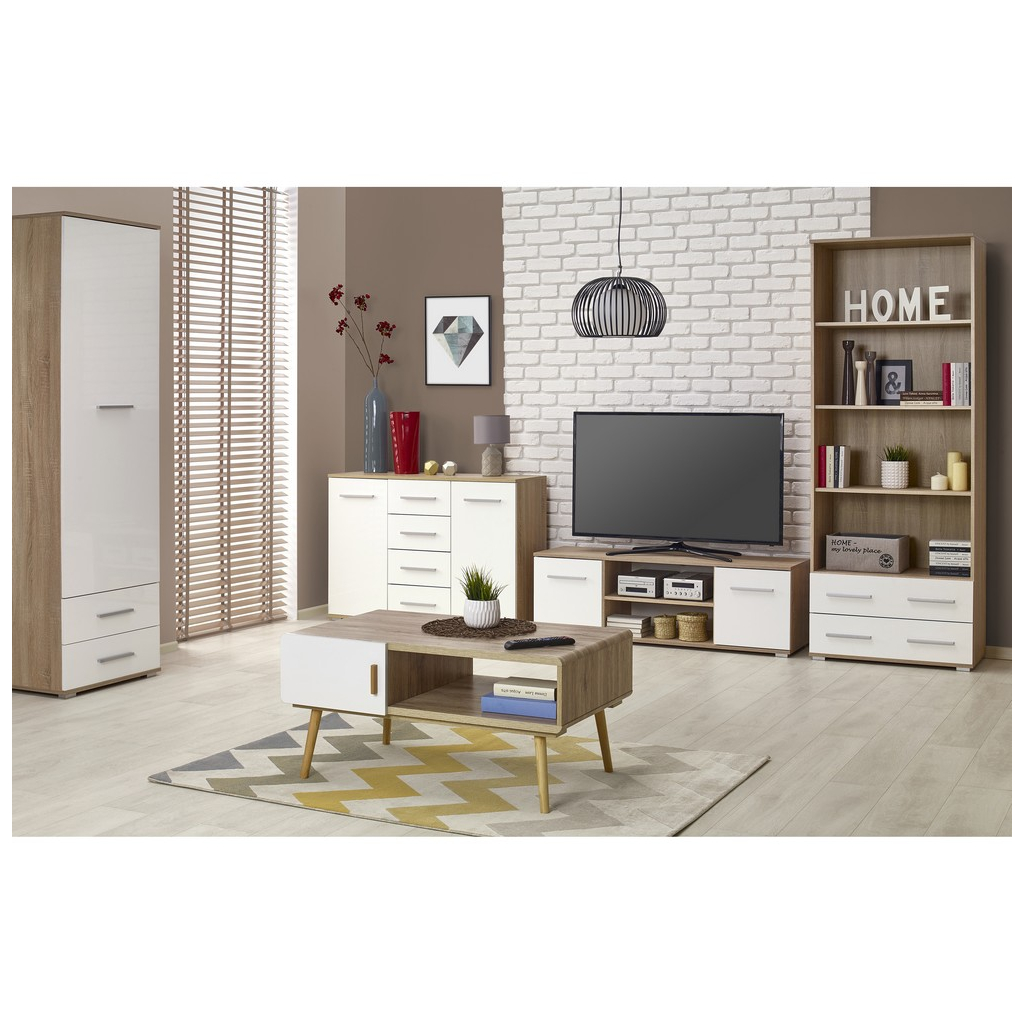 Jej konštrukcia je vyrobená z drevotrieskových laminovaných dosiek opatrených ABS hranou. Dodávame ju v 3 farebných variantoch – v kombinácii bieleho vysokého lesku s dubom sonoma, v dube sonoma a v čistom bielom vysokom lesku.