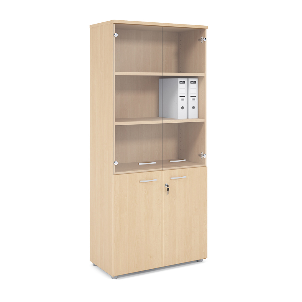Skriňu vám dodáme so sklenenými krídlovými dverami, ktoré sú určené pre hornú časť a so spodnými krídlovými dverami z dreva, ktoré sú vybavené kovovými úchytkami a bezpečnostným zámkom.