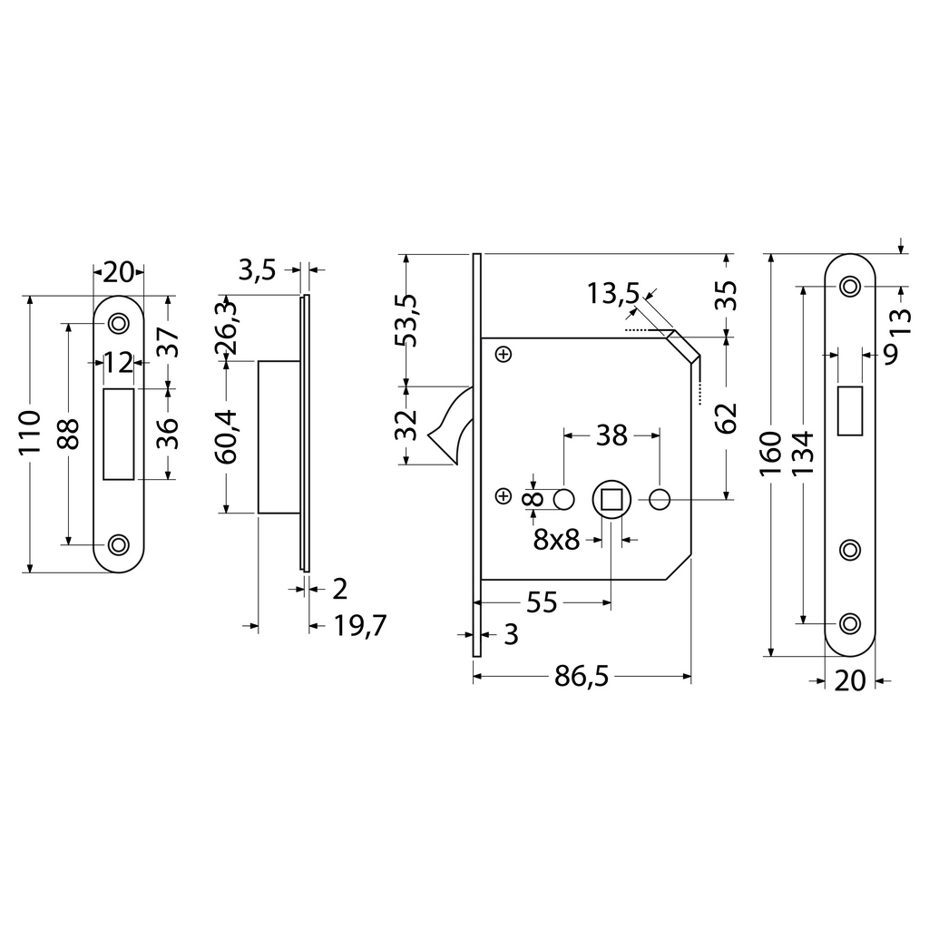 Zadlabací WC zámok pre posuvné dvere EN.304.HKM.WC.55.20