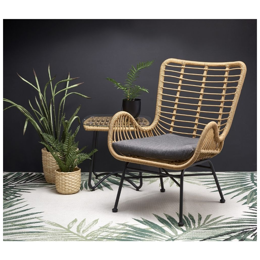 Vyrobená je z ocele potiahnutej umelým ratanom, čo zaisťuje stoličke vysokú odolnosť voči vplyvom počasia. Vlákna sú mrazuodolné, čím nedochádza k degradácii ani strate farby materiálu. Pohodlné posedenie zaistí široký a dostatočne vypchatý podsedák.