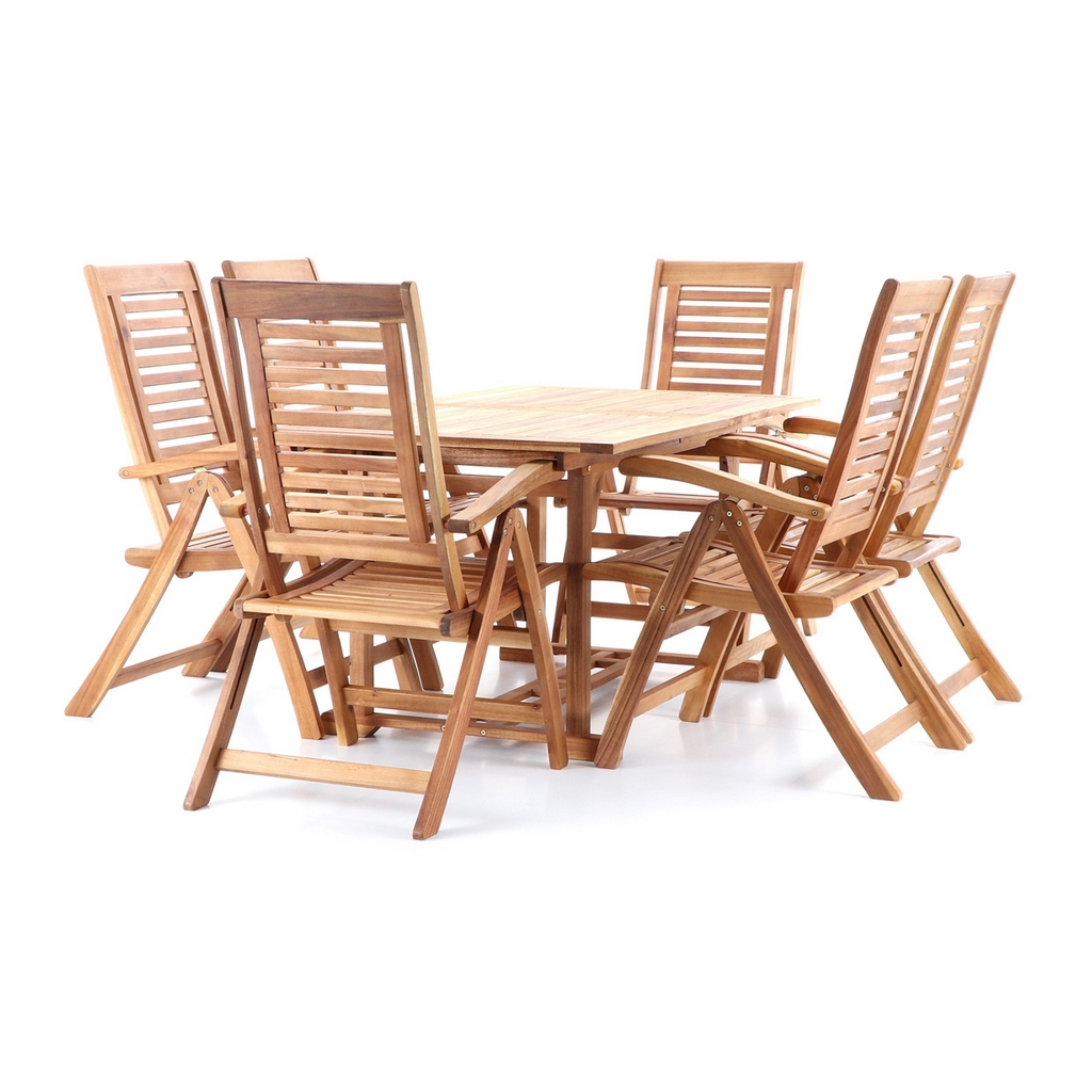 Nespornou výhodou tejto záhradnej zostavy je možnosť rozloženia stolovej dosky. V základnom zloženom stave je jej dĺžka 150 cm, v rozloženom potom 190 cm. Môžete tak vytvoriť priestor pre ďalšie 2 miesta na sedenie. Oceníte taktiež polohovanie chrbtového operadla v prípade záhradných stoličiek.