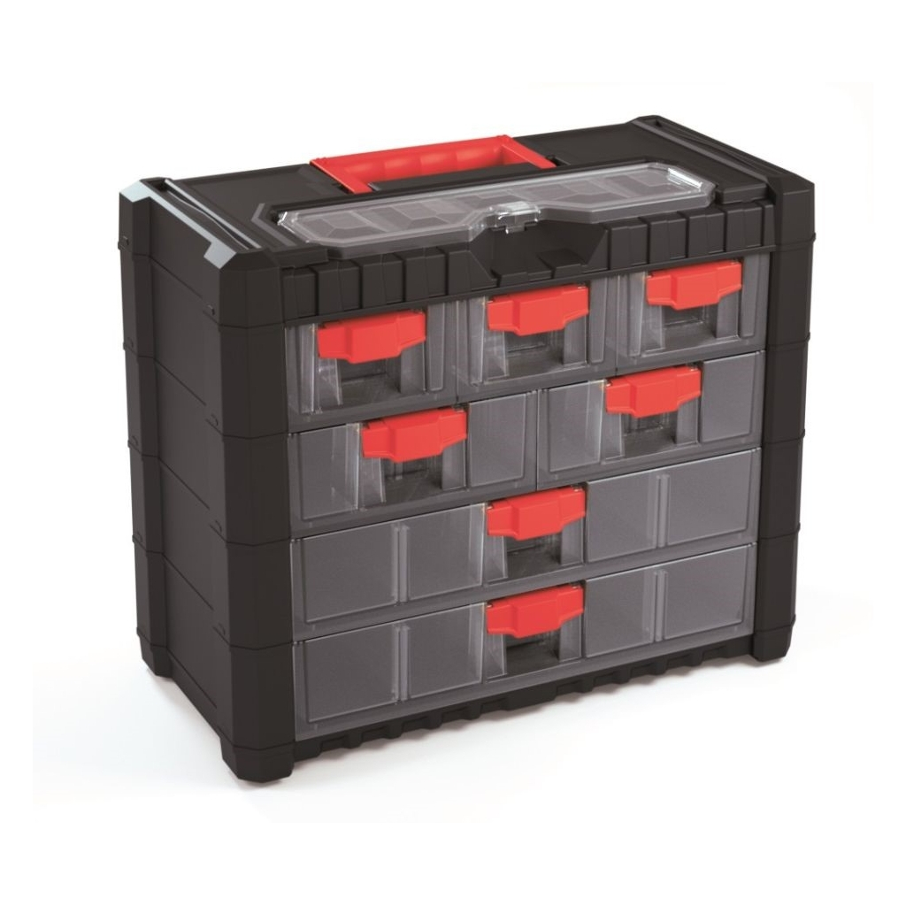 Tento typ organizéru vám ponúkne široké možnosti využitia. Okrem niekoľkých zásuviek k uloženiu drobného náradia a súčiastok je vybavený ergonomickou rukoväťou, takže s ním môžete zachádzať ako s kufrom, i možnosťou montáže na stenu. Madlo je naviac sklopné, čo vám v prípade potreby umožní položiť viac týchto organizérov na seba.