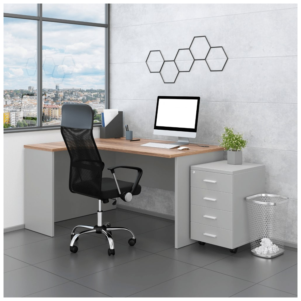 Zostavu SimpleOffice 2 tvorí rohový pracovný stôl (v tomto prípade ľavý) a pojazdný kontajner so 4 zásuvkami. Spoločne položí základy vášho kancelárskeho pracoviska a zaistí vám množstvo úložného i pracovného priestoru. K dokonalosti už potom chýba iba pohodlná stolička.