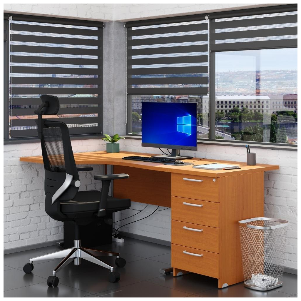 Zostavu Visio 3 tvorí rohový pracovný stôl a prístavný kontajner so 4 zásuvkami. Spojením týchto prvkov si v kancelárii vytvoríte príjemné pracovné zákutia s množstvom miesta na všetko, čo chcete mať po ruke. Kontajner má predĺženú dosku, ktorej hĺbka zodpovedá doske stola. Vďaka tomu oba prvky dokonale lícujú.