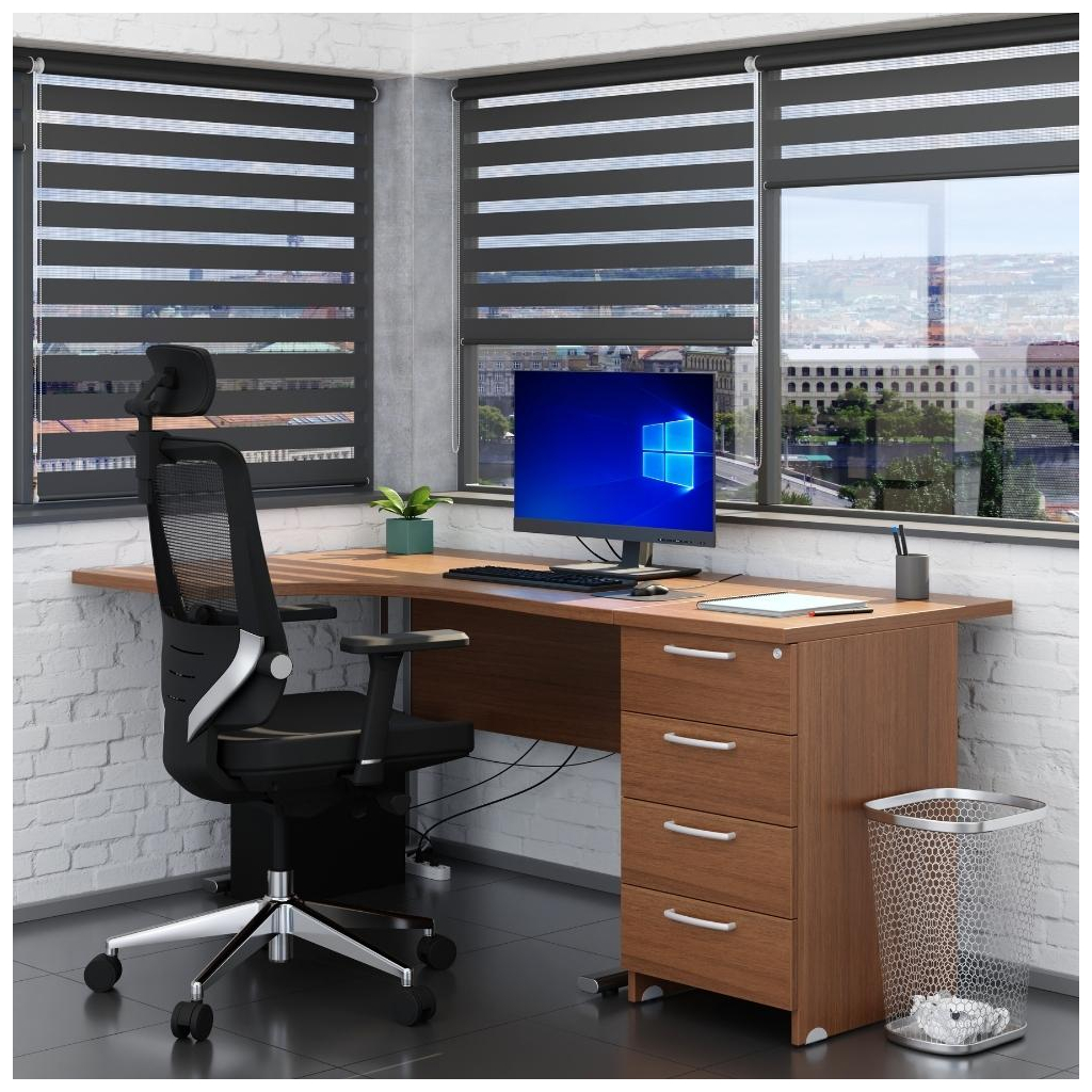 Zostavu Visio 3 tvorí rohový pracovný stôl a prístavný kontajner so 4 zásuvkami. Spojením týchto prvkov si v kancelárii vytvoríte príjemné pracovné zákutia s množstvom miesta na všetko, čo chcete mať po ruke. Kontajner má predĺženú dosku, ktorej hĺbka zodpovedá doske stola. Vďaka tomu oba prvky dokonale lícujú.