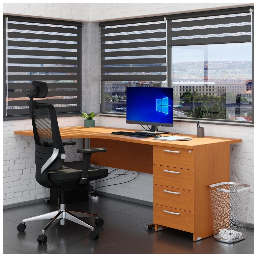 Zostavu Visio 3 tvorí rohový pracovný stôl a prístavný kontajner so 4 zásuvkami. Spojením týchto prvkov si v kancelárii vytvoríte príjemné pracovné zákutia s množstvom miesta na všetko, čo chcete mať po ruke. Kontajner má predĺženú dosku, ktorej hĺbka zodpovedá doske stola. Vďaka tomu oba prvky dokonale lícujú.