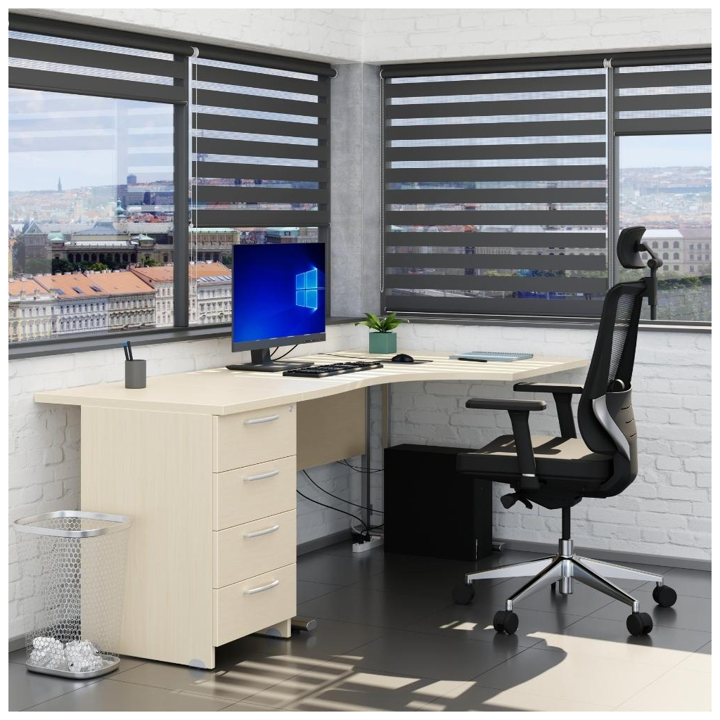 Zostavu Visio 3 tvorí rohový pracovný stôl a prístavný kontajner so 4 zásuvkami. Spojením týchto prvkov si v kancelárii vytvoríte príjemné pracovné zákutia s množstvom miesta na všetko, čo chcete mať po ruke. Kontajner má predĺženú dosku, ktorej hĺbka zodpovedá doske stola. Vďaka tomu oba prvky dokonale lícujú.